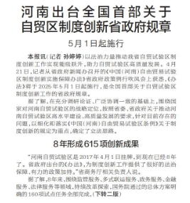 河南出台全国首部关于自贸区制度创新省政府规章