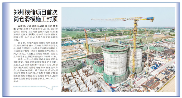 历经9天连续作业,近日,郑州粮储项目102号、103号筒仓顺利完成29.35米滑升高度施工,标志着首次滑模施工圆满封顶,为后续40个筒仓施工提供精准样板。(今日《郑州日报》1版)