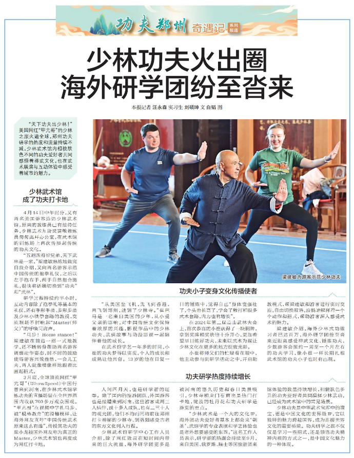 “天下功夫出少林!”美国网红“甲亢哥”的少林之旅火遍全球,郑州功夫研学的热度和流量持续不减,少林武术馆内相貌肤色不同的功夫爱好者共同感悟着禅武文化,也在武术展演与互动体验中感受着城市的魅力。(今日《郑州日报》5版)