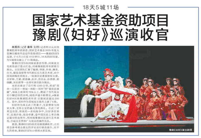记者昨日从河南豫剧院青年团获悉,国家艺术基金2025年度大型舞台剧和作品创作资助项目——豫剧《妇好》巡演,于4月2日至19日举行,18天的时间里,为5城观众献上了11场演出。(今日《郑州日报》8版)