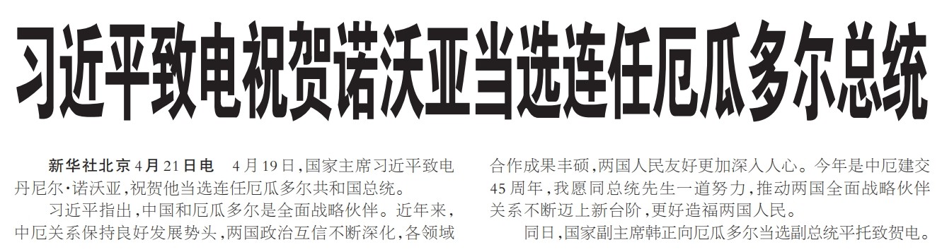 4月19日,国家主席习近平致电丹尼尔·诺沃亚,祝贺他当选连任厄瓜多尔共和国总统。(今日《人民日报》1版)