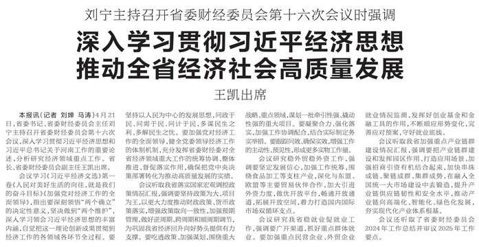 4月21日,省委书记、省委财经委员会主任刘宁主持召开省委财经委员会第十六次会议,深入学习贯彻习近平经济思想和习近平总书记关于河南工作的重要论述,分析研究经济领域重点工作。省长、省委财经委员会副主任王凯出席。(今日《河南日报》1版)