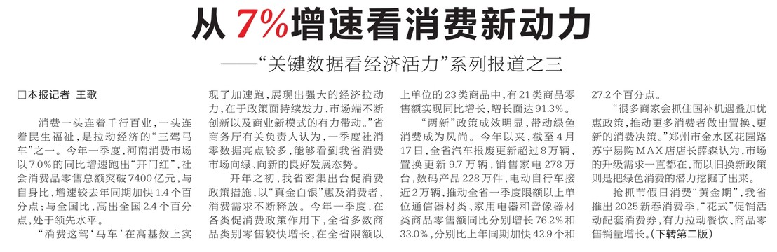 消费一头连着千行百业,一头连着民生福祉,是拉动经济的“三驾马车”之一。今年一季度,河南消费市场以7.0%的同比增速跑出“开门红”,社会消费品零售总额突破7400亿元,与自身比,增速较去年同期加快1.4个百分点;与全国比,高出全国2.4个百分点,处于领先水平。(今日《河南日报》1版、2版)