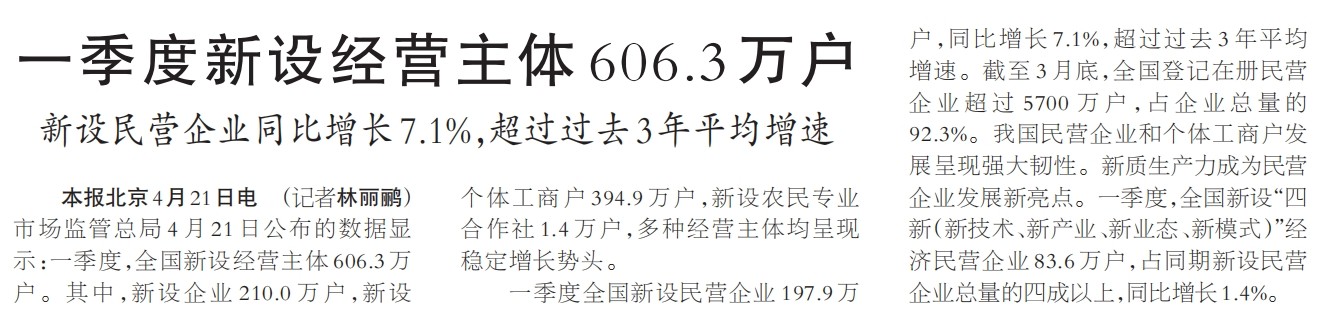 市场监管总局4月21日公布的数据显示:一季度,全国新设经营主体606.3万户。其中,新设企业210.0万户,新设个体工商户394.9万户,新设农民专业合作社1.4万户,多种经营主体均呈现稳定增长势头。(今日《人民日报》1版)