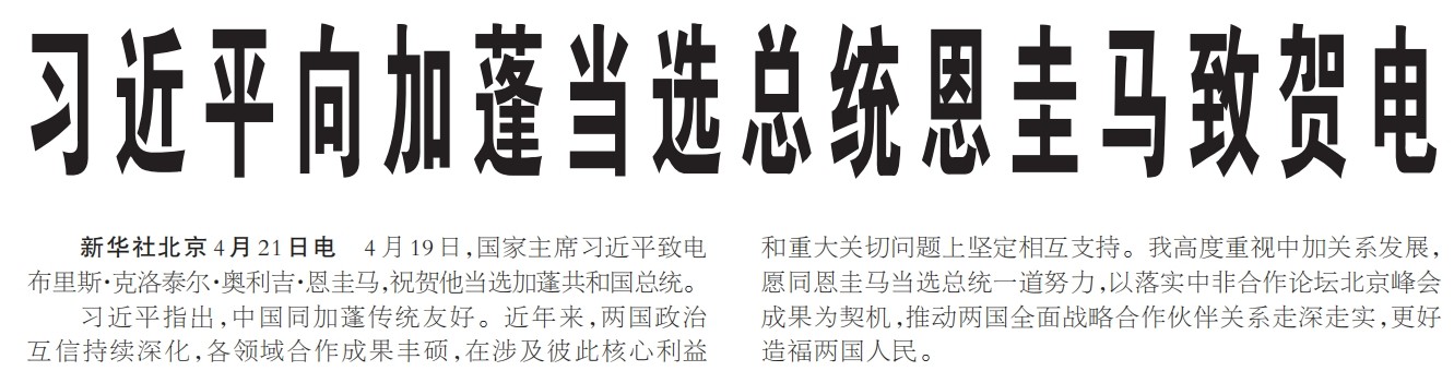 4月19日,国家主席习近平致电布里斯·克洛泰尔·奥利吉·恩圭马,祝贺他当选加蓬共和国总统。