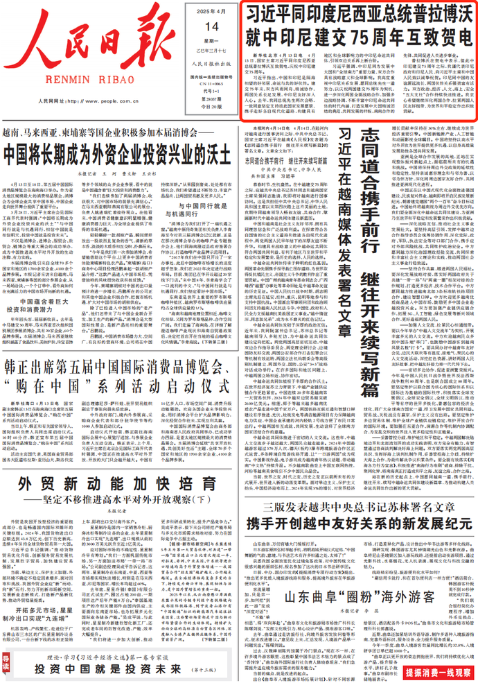 4月13日,国家主席习近平同印度尼西亚总统普拉博沃互致贺电,庆祝中印尼建交75周年。