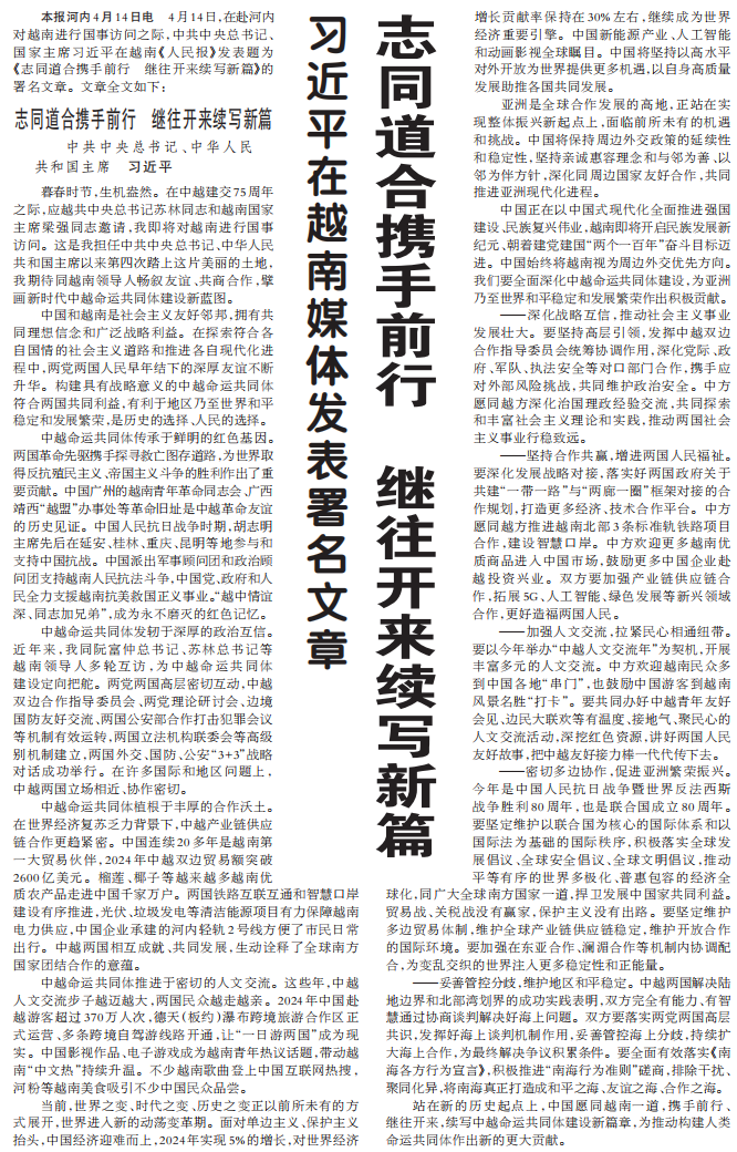 4月14日,在赴河内对越南进行国事访问之际,中共中央总书记、国家主席习近平在越南《人民报》发表题为《志同道合携手前行 继往开来续写新篇》的署名文章。文章全文如下: