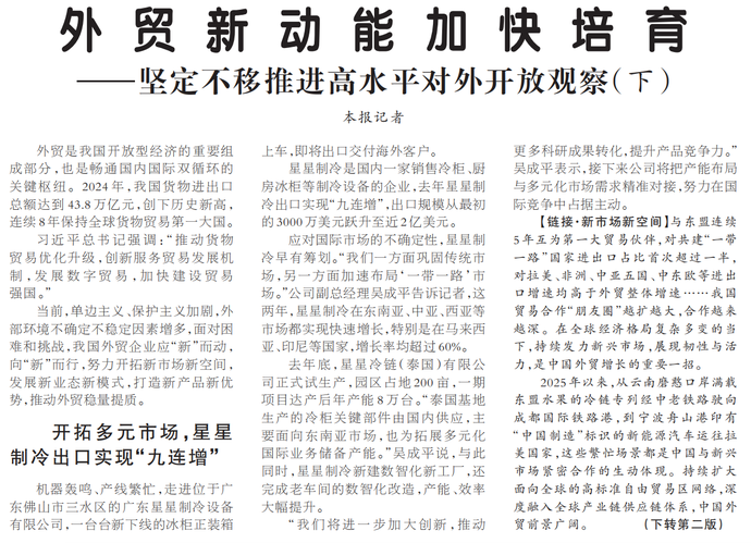 外贸是我国开放型经济的重要组成部分,也是畅通国内国际双循环的关键枢纽。2024年,我国货物进出口总额达到43.8万亿元,创下历史新高,连续8年保持全球货物贸易第一大国。(今日《人民日报》1版、2版)