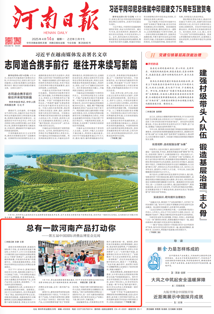 透视全球消费新趋势、联通国内国际两个市场,在全球经济发展不确定性上升的当下,4月13日在海南海口开幕的第五届中国国际消费品博览会(以下简称“消博会”),成为豫企把握消费新潮、开拓国内外新客户的重要平台。河南高度重视消博会,共组织近百家特色企业及龙头采购企业参展参会。(今日《河南日报》1版)