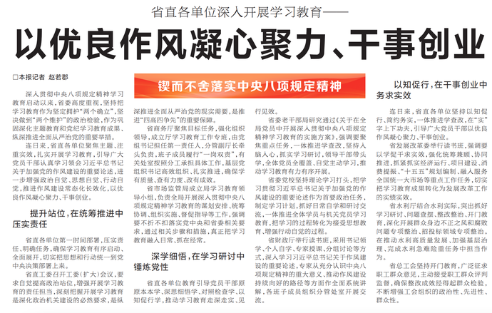 深入贯彻中央八项规定精神学习教育启动以来,省委高度重视,坚持把学习教育作为坚定拥护“两个确立”,坚决做到“两个维护”的政治检验,作为巩固深化主题教育和党纪学习教育成果、纵深推进全面从严治党的重要举措。(今日《河南日报》2版)