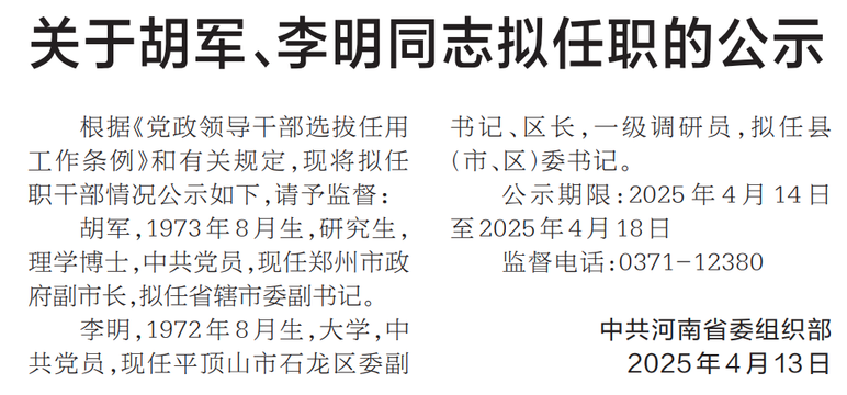 胡军,1973年8月生,研究生,理学博士,中共党员,现任郑州市政府副市长,拟任省辖市委副书记。
