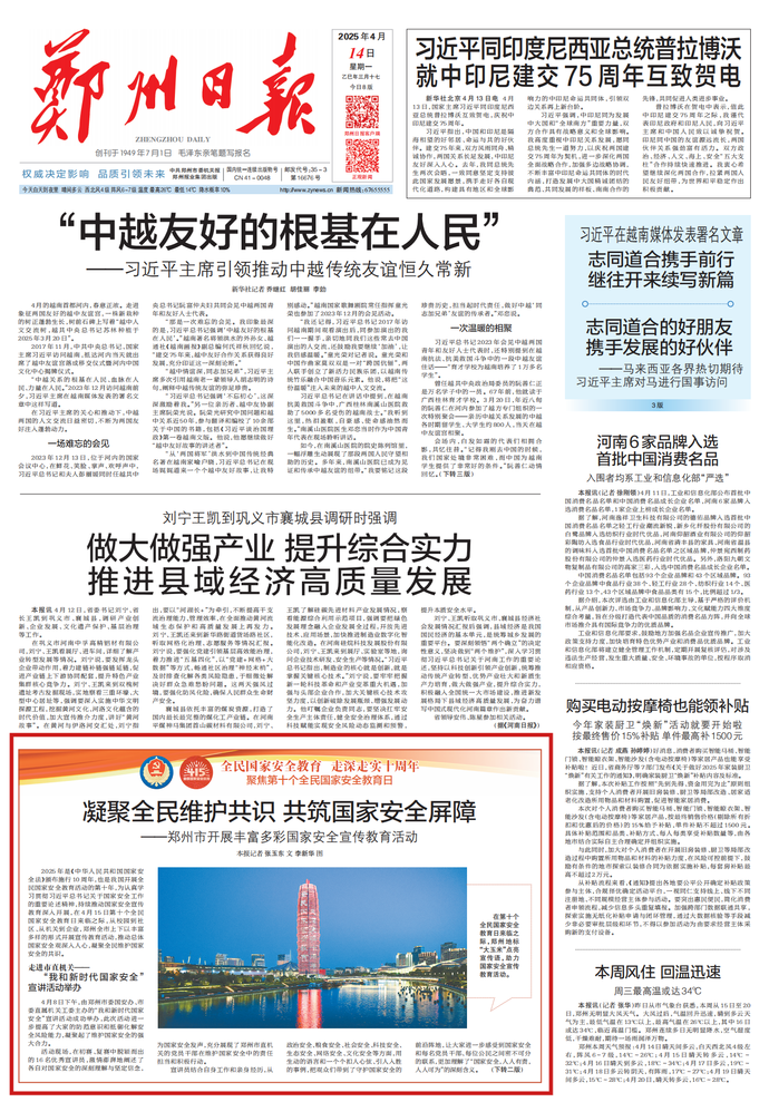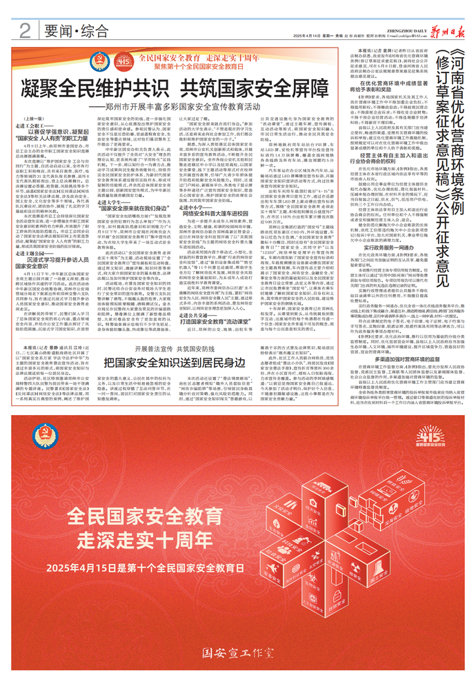 2025年是《中华人民共和国国家安全法》颁布施行10周年,也是我国开展全民国家安全教育活动的第十年,为认真学习贯彻习近平总书记关于国家安全工作的重要论述精神,持续推动国家安全宣传教育深入开展,在4月15日第十个全民国家安全教育日来临之际,从校园到社区、从机关到企业,郑州全市上下以丰富多样的形式开展宣传教育活动,推动总体国家安全观深入人心,凝聚全民维护国家安全的共识。(今日《郑州日报》1版、2版)
