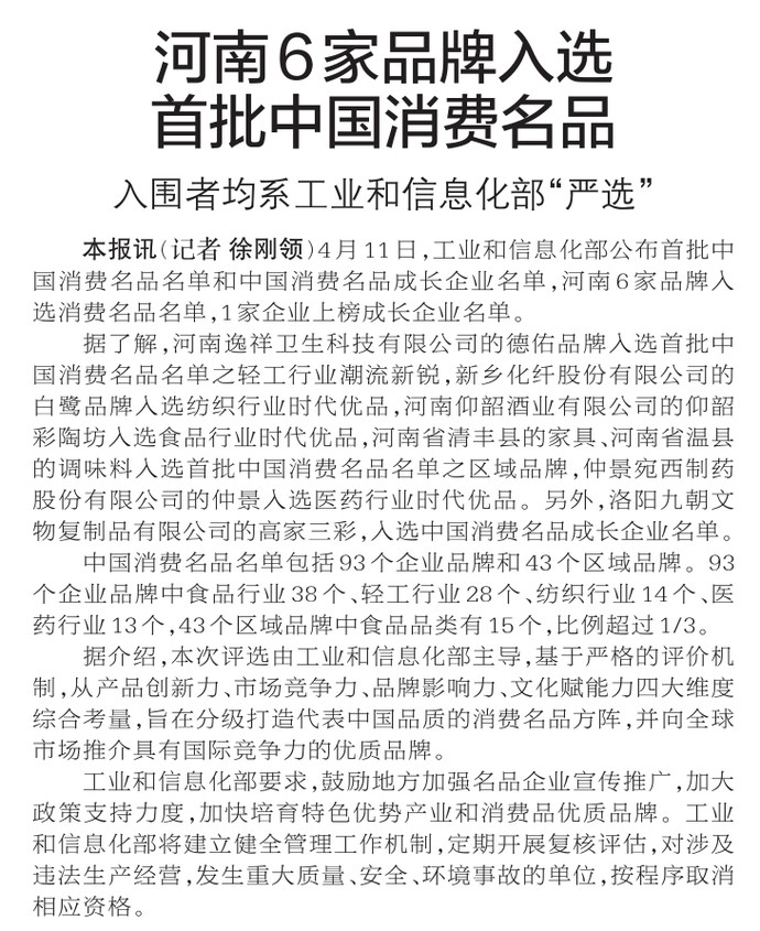 4月11日,工业和信息化部公布首批中国消费名品名单和中国消费名品成长企业名单,河南6家品牌入选消费名品名单,1家企业上榜成长企业名单。(今日《郑州日报》1版)
