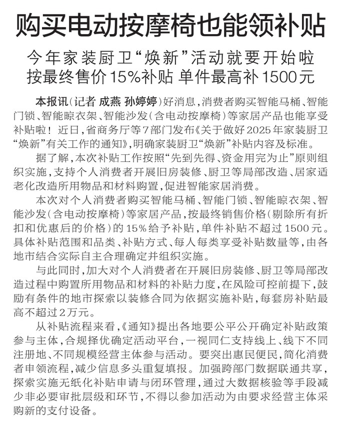 好消息,消费者购买智能马桶、智能门锁、智能晾衣架、智能沙发(含电动按摩椅)等家居产品也能享受补贴啦!近日,省商务厅等7部门发布《关于做好2025年家装厨卫“焕新”有关工作的通知》,明确家装厨卫“焕新”补贴内容及标准。(今日《郑州日报》1版)