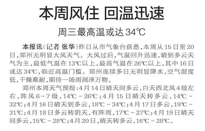 昨日从市气象台获悉,本周从15日至20日,郑州无明显大风天气。大风过后,气温回升迅速,晴到多云天气为主,最低气温在13℃以上,最高气温在26℃以上,其中16日或达34℃,临近高温门槛。郑州连续多日无明显降水,空气湿度低,干燥难耐,期待一场雨润泽万物。(今日《郑州日报》1版)