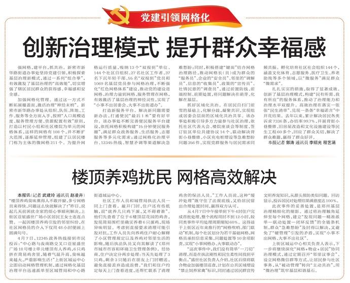 “楼顶养鸡臭味熏得人不敢开窗,多亏网格员来得快,问题这么快就解决了!”昨日,说起几天前困扰全家的烦心事顺利解决,上街区亚星盛世广场小区居民王女士连连点赞。一起因楼顶养鸡引发的邻里纠纷,在社区网格员的介入下仅用48小时便画上圆满句号。(今日《郑州日报》5版)