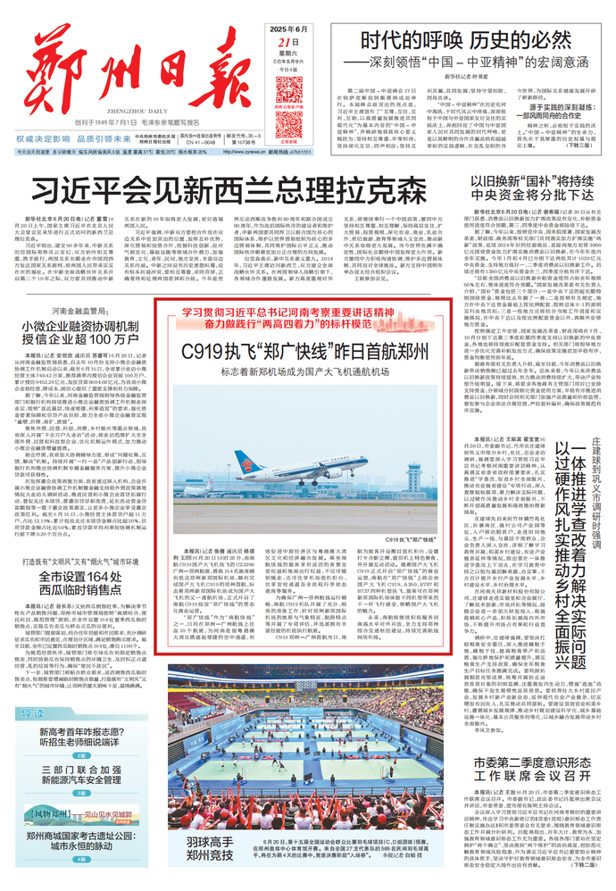 6月20日10时28分,由南航C919国产大飞机执飞的CZ3396广州—郑州航班,搭载154名旅客顺利抵达郑州新郑国际机场,顺利完成国产大飞机C919的郑州首航,标志着郑州新郑国际机场成为国产大飞机的又一通航机场,正式开启了南航C919投放“郑广快线”的常态化商业运营。(今日《郑州日报》1版)