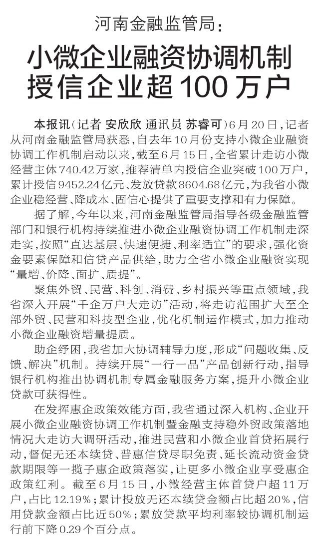 6月20日,记者从河南金融监管局获悉,自去年10月份支持小微企业融资协调工作机制启动以来,截至6月15日,全省累计走访小微经营主体740.42万家,推荐清单内授信企业突破100万户,累计授信9452.24亿元、发放贷款8604.68亿元,为我省小微企业稳经营、降成本、固信心提供了重要支撑和有力保障。(今日《郑州日报》1版)