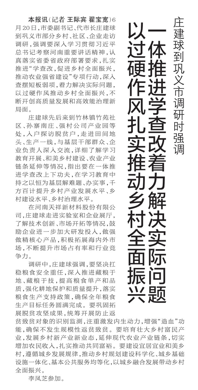 6月20日,市委副书记、代市长庄建球到巩义市部分乡村、社区、企业走访调研,强调要深入学习贯彻习近平总书记考察河南重要讲话精神,认真落实省委省政府部署要求,扎实推进“学查改,促进乡村全面振兴,推动农业强省建设”专项行动,深入查摆短板弱项,着力解决实际问题,以过硬作风推动乡村全面振兴,不断开创高质量发展和高效能治理新局面。(今日《郑州日报》1版)