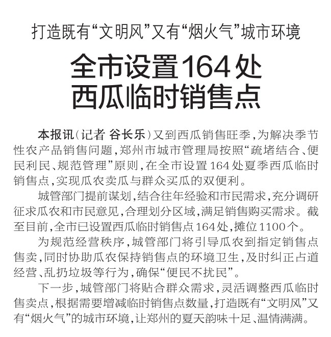 又到西瓜销售旺季,为解决季节性农产品销售问题,郑州市城市管理局按照“疏堵结合、便民利民、规范管理”原则,在全市设置164处夏季西瓜临时销售点,实现瓜农卖瓜与群众买瓜的双便利。(今日《郑州日报》1版)