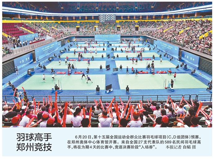 6月20日,第十五届全国运动会群众比赛羽毛球项目(C、D组团体)预赛,在郑州奥体中心体育馆开赛。来自全国27支代表队的589名民间羽毛球高手,将在为期4天的比赛中,竞逐决赛阶段“入场券”。(今日《郑州日报》1版)