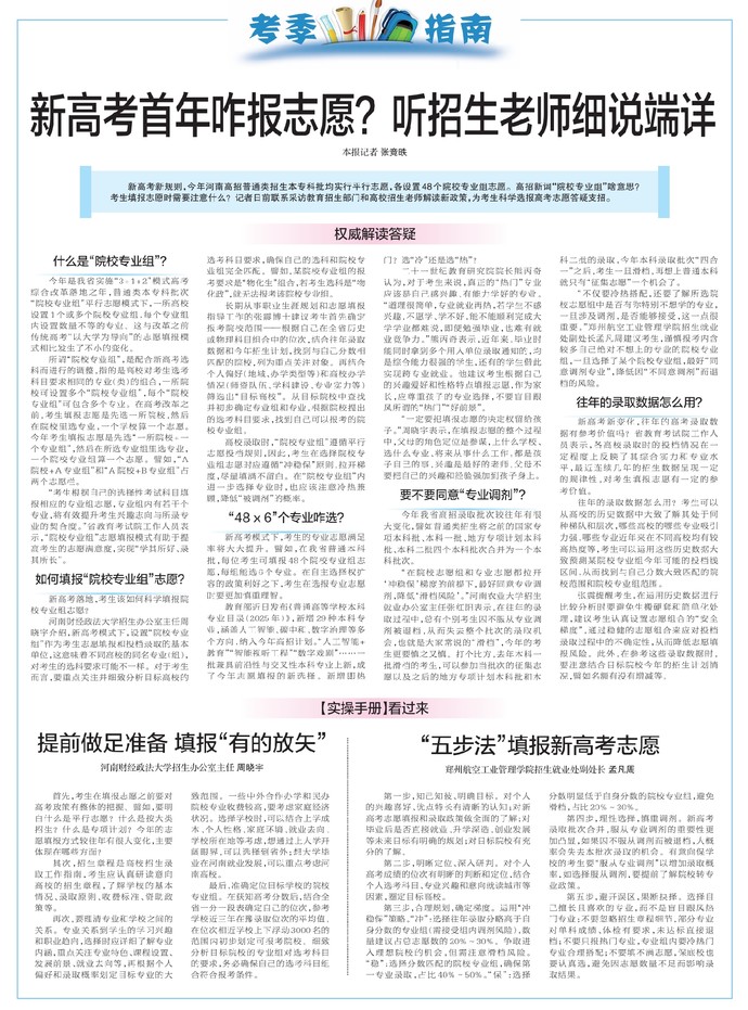新高考新规则,今年河南高招普通类招生本专科批均实行平行志愿,各设置48个院校专业组志愿。高招新词“院校专业组”啥意思?考生填报志愿时需要注意什么?记者日前联系采访教育招生部门和高校招生老师解读新政策,为考生科学选报高考志愿答疑支招。(今日《郑州日报》2版)
