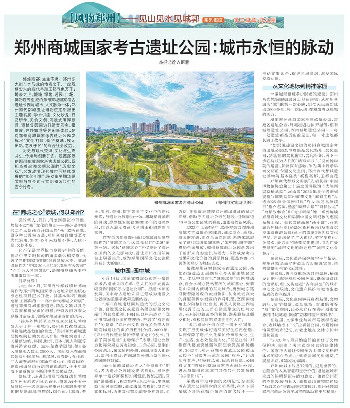 煌煌商都,生生不息。郑州东大街车水马龙的地表之下,一座规模宏大的商代早期王都气象万千;地表之上,城墙、绿地、游园、广场、博物院等组成的郑州商城国家考古遗址公园与城市、人文融为一体:郑州商代都城遗址博物院定期推出主题临展、学术讲座、文化沙龙、日常研学、美食文创、沉浸式演绎剧目;遗址公园周边打造音乐会、摄影展、户外露营等休闲新体验,使得郑州商城国家考古遗址公园发挥出“文化打底,保护奠基,展示出彩,惠及于民”的综合社会效益。(今日《郑州日报》4版)