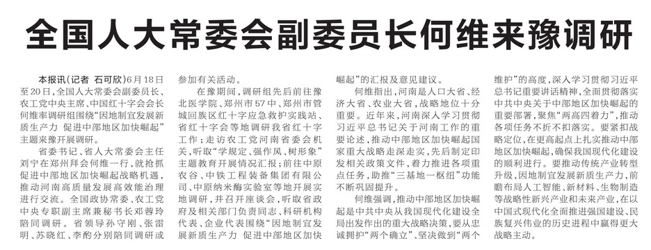 6月18日至20日,全国人大常委会副委员长、农工党中央主席、中国红十字会会长何维率调研组围绕“因地制宜发展新质生产力 促进中部地区加快崛起”主题来豫开展调研。(今日《河南日报》1版)