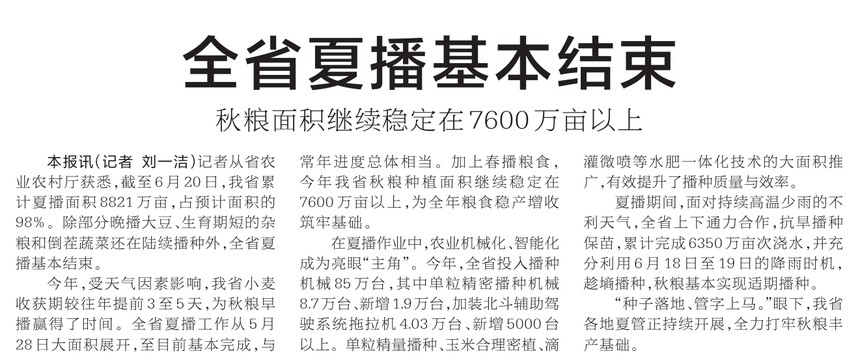 记者从省农业农村厅获悉,截至6月20日,我省累计夏播面积8821万亩,占预计面积的98%。除部分晚播大豆、生育期短的杂粮和倒茬蔬菜还在陆续播种外,全省夏播基本结束。(今日《河南日报》1版)