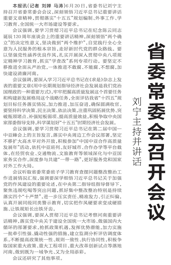 6月20日,省委书记刘宁主持召开省委常委会会议,深刻领悟习近平总书记重要讲话重要文章精神,贯彻落实“十五五”规划编制、外事工作、学习教育、全国统一大市场建设等要求。
