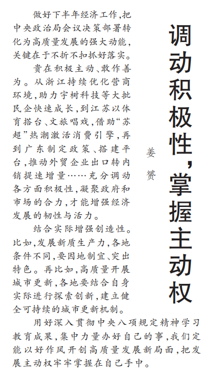 做好下半年经济工作,把中央政治局会议决策部署转化为高质量发展的强大动能,关键在于不折不扣抓好落实。(今日《人民日报》1版)