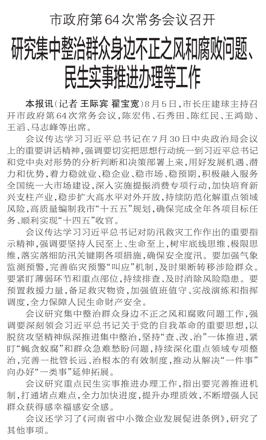 8月5日,市长庄建球主持召开市政府第64次常务会议,陈宏伟、石秀田、陈红民、王鸿勋、王滔、马志峰等出席。(今日《郑州日报》1版)