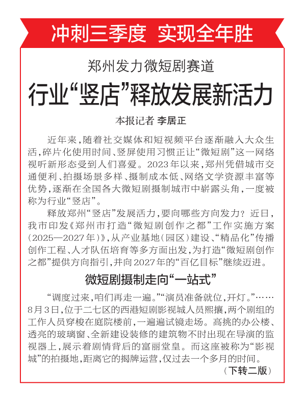 近年来,随着社交媒体和短视频平台逐渐融入大众生活,碎片化使用时间、竖屏使用习惯正让“微短剧”这一网络视听新形态受到人们喜爱。2023年以来,郑州凭借城市交通便利、拍摄场景多样、摄制成本低、网络文学资源丰富等优势,逐渐在全国各大微短剧摄制城市中崭露头角,一度被称为行业“竖店”。(今日《郑州日报》1版、2版)