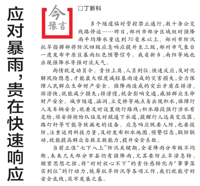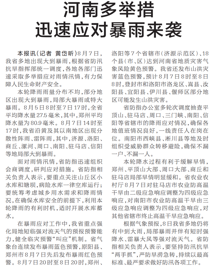 8月7日,我省多地出现大到暴雨,根据省防汛抗旱指挥部统一调度,各地各部门迅速采取多举措应对雨情汛情,有力保障人民生命财产安全。(今日《河南日报》1版)