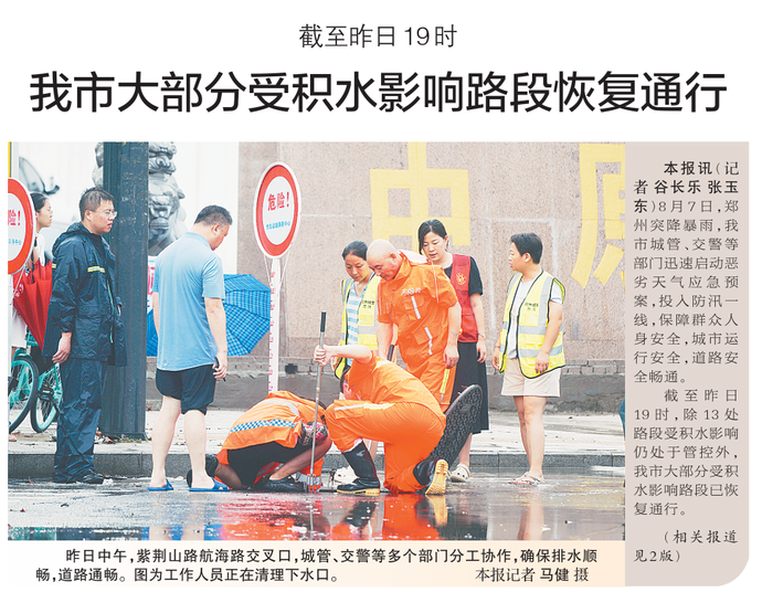 8月7日,郑州突降暴雨,我市城管、交警等部门迅速启动恶劣天气应急预案,投入防汛一线,保障群众人身安全,城市运行安全,道路安全畅通。(今日《郑州日报》1版、2版)