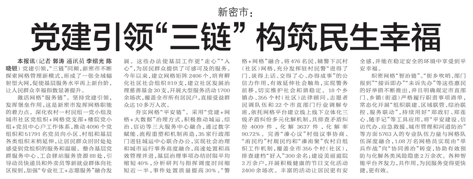 党建引领,“三链”同频,新密市不断探索网格管理新模式,形成了一张全域辐射型大网,促使基层服务水平再上新台阶,让人民群众幸福指数显著提升。(今日《郑州日报》7版)