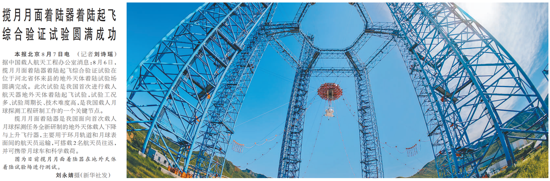 据中国载人航天工程办公室消息:8月6日,揽月月面着陆器着陆起飞综合验证试验在位于河北省怀来县的地外天体着陆试验场圆满完成。此次试验是我国首次进行载人航天器地外天体着陆起飞试验,试验工况多、试验周期长、技术难度高,是我国载人月球探测工程研制工作的一个关键节点。(今日《人民日报》1版)