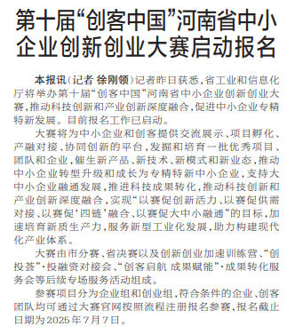 记者昨日获悉,省工业和信息化厅将举办第十届“创客中国”河南省中小企业创新创业大赛,推动科技创新和产业创新深度融合,促进中小企业专精特新发展。目前报名工作已启动。(今日《郑州日报》1版)