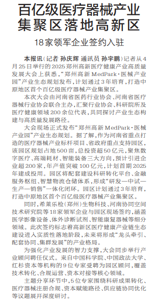 记者从4月25日举行的2025郑州高新医疗健康产业高质量发展大会上获悉,“郑州高新MedPark·医械产业园”产业生态规划发布,计划通过3年培育,打造中原地区首个百亿级医疗器械产业集聚区。(今日《郑州日报》1版)