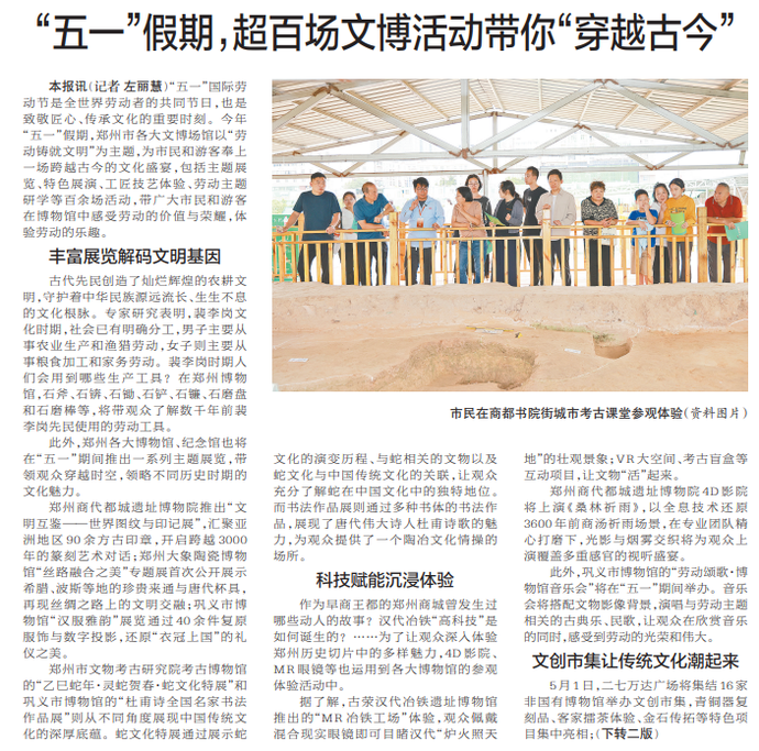 “五一”国际劳动节是全世界劳动者的共同节日,也是致敬匠心、传承文化的重要时刻。今年“五一”假期,郑州市各大文博场馆以“劳动铸就文明”为主题,为市民和游客奉上一场跨越古今的文化盛宴,包括主题展览、特色展演、工匠技艺体验、劳动主题研学等百余场活动,带广大市民和游客在博物馆中感受劳动的价值与荣耀,体验劳动的乐趣。(今日《郑州日报》1版、2版)