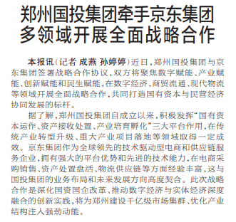 近日,郑州国投集团与京东集团签署战略合作协议,双方将聚焦数字赋能、产业赋能、创新赋能和民生赋能,在数字经济、商贸流通、现代物流等领域开展全面战略合作,共同打造国有资本与民营经济协同发展的标杆。(今日《郑州日报》1版)