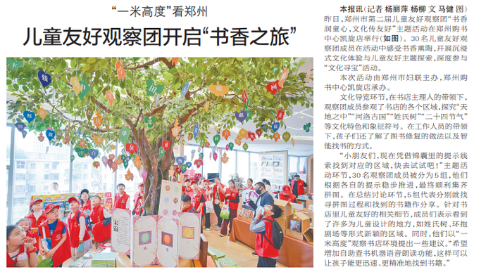 昨日,郑州市第二届儿童友好观察团“书香润童心,文化传友好”主题活动在郑州购书中心凯旋店举行。30名儿童友好观察团成员在活动中感受书香熏陶,开展沉浸式文化体验与儿童友好主题探索,深度参与“文化寻宝”活动。(今日《郑州日报》2版)