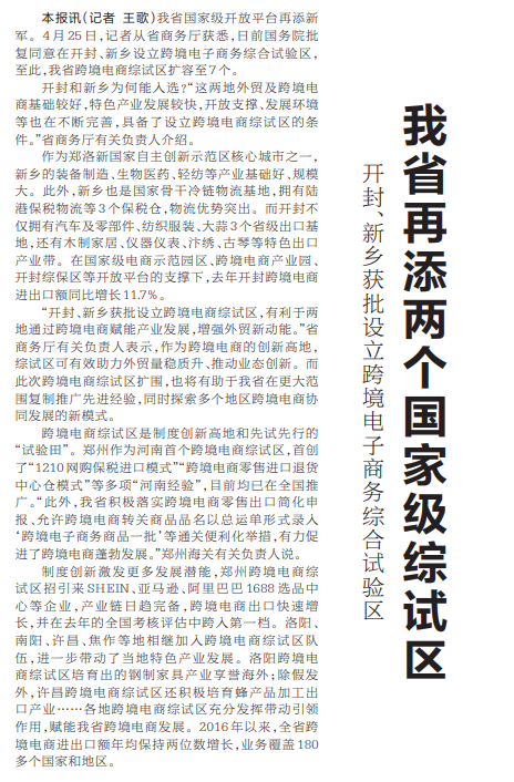 我省国家级开放平台再添新军。4月25日,记者从省商务厅获悉,日前国务院批复同意在开封、新乡设立跨境电子商务综合试验区,至此,我省跨境电商综试区扩容至7个。(今日《河南日报》1版)