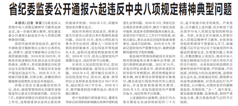 为推进深入贯彻中央八项规定精神学习教育走深走实,进一步强化警示教育,省纪委监委公开通报6起违反中央八项规定精神典型问题。(今日《河南日报》2版)