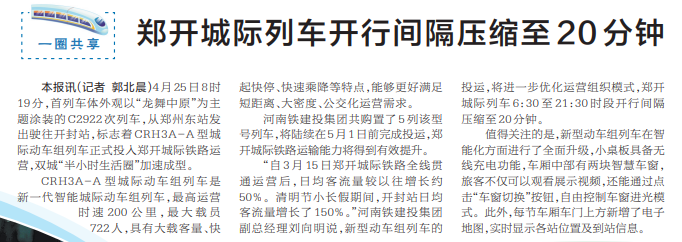 4月25日8时19分,首列车体外观以“龙舞中原”为主题涂装的C2922次列车,从郑州东站发出驶往开封站,标志着CRH3A-A型城际动车组列车正式投入郑开城际铁路运营,双城“半小时生活圈”加速成型。(今日《河南日报》3版)