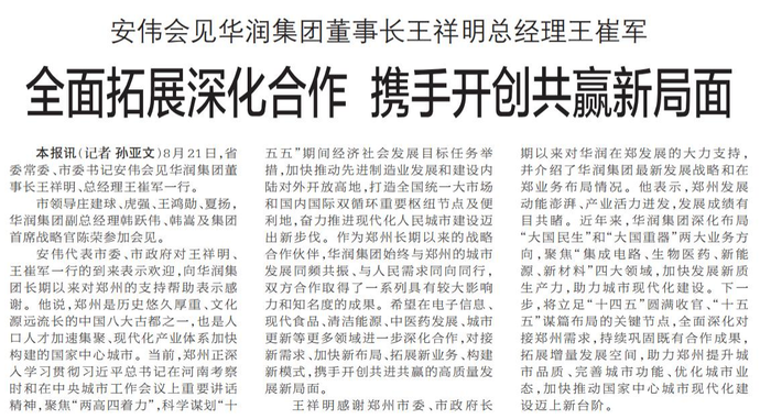 8月21日,省委常委、市委书记安伟会见华润集团董事长王祥明、总经理王崔军一行。