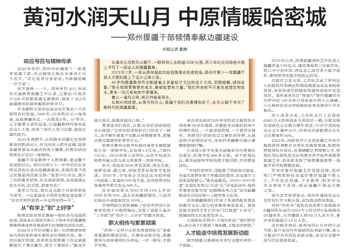 从黄河之滨到天山脚下,一群郑州儿女跨越2500公里,用三年时光在哈密大地上书写了一段动人的援疆篇章。(今日《郑州日报》2版)