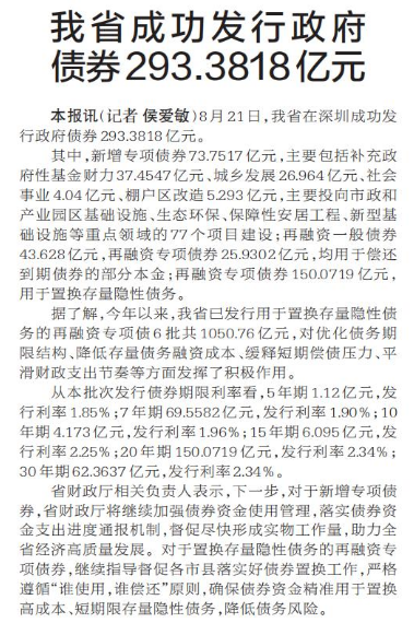8月21日,我省在深圳成功发行政府债券293.3818亿元。(今日《郑州日报》2版)