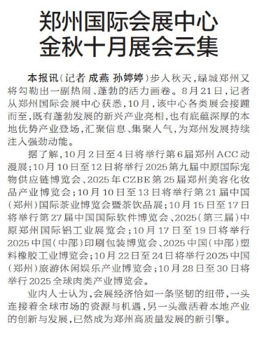 步入秋天,绿城郑州又将勾勒出一副热闹、蓬勃的活力画卷。8月21日,记者从郑州国际会展中心获悉,10月,该中心各类展会接踵而至,既有蓬勃发展的新兴产业亮相,也有底蕴深厚的本地优势产业登场,汇聚信息、集聚人气,为郑州发展持续注入强劲动能。(今日《郑州日报》2版)