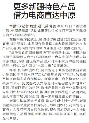 8月19日,“疆货进中原,电商谱新篇”活动成果签约仪式在河南瓴谷国际新电商产业园成功举行。(今日《郑州日报》2版)